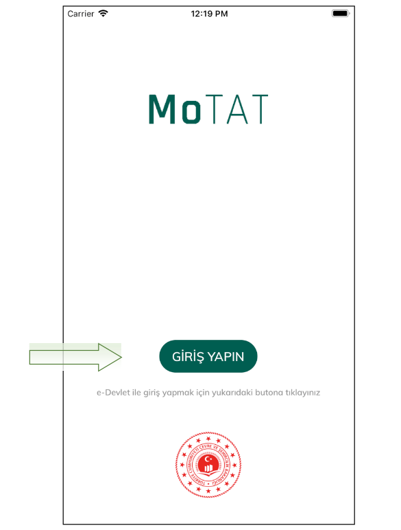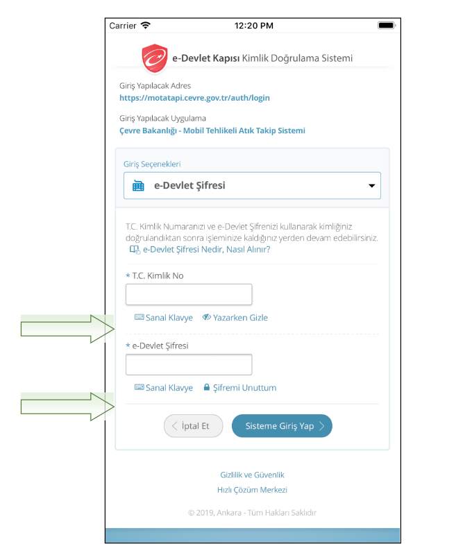 Uygulamaya giriş E-Devlet entegrasyonu üzerinden sağlanmaktadır. GİRİŞ YAPIN Butonuna basılarak E-Devlet ekranlarına yönlendirme sağlanır. Kullanıcı E-Devlet sayfasında mevcut giriş bilgilerini girerek uygulamaya güvenli giriş sağlanmış olur.
