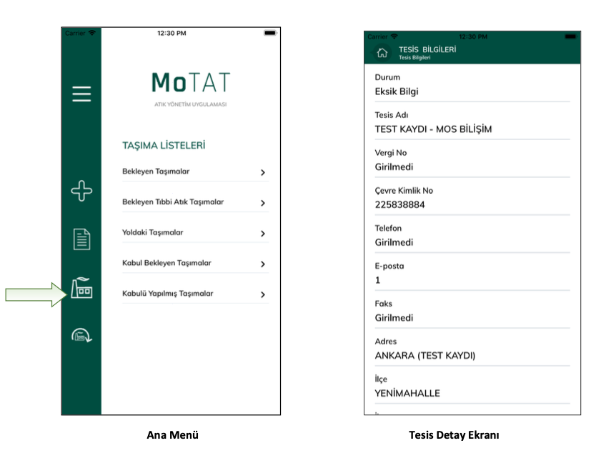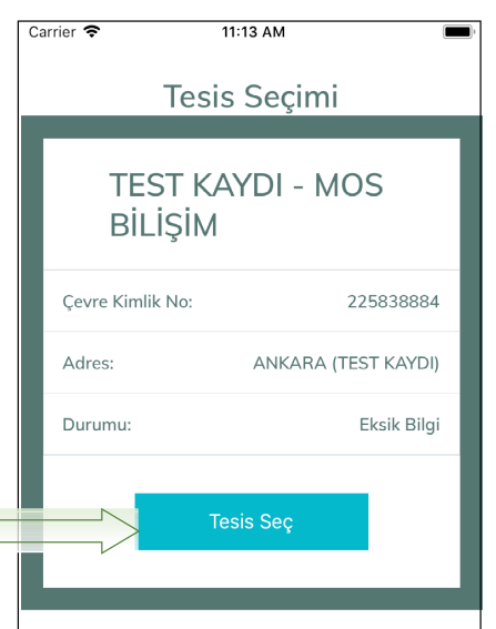 Kullanıcı yönlendirme sonrasında uygulamaya girmeden önce hangi tesis üzerinden işlem yapacağını seçmelidir. Daha sonra uygulama içerisindeki menülerden üzerinde işlem yapacağı tesisi yine değiştirebilme imkânı olacaktır.
