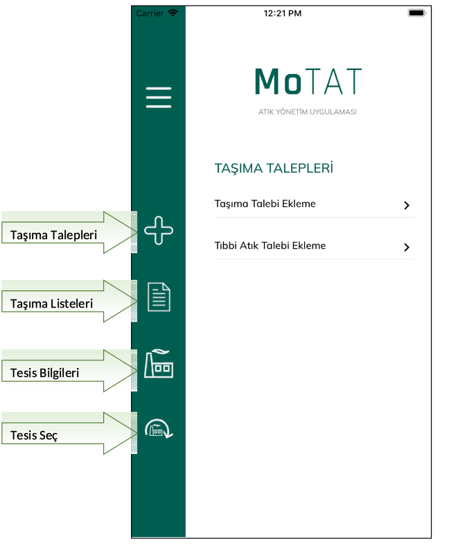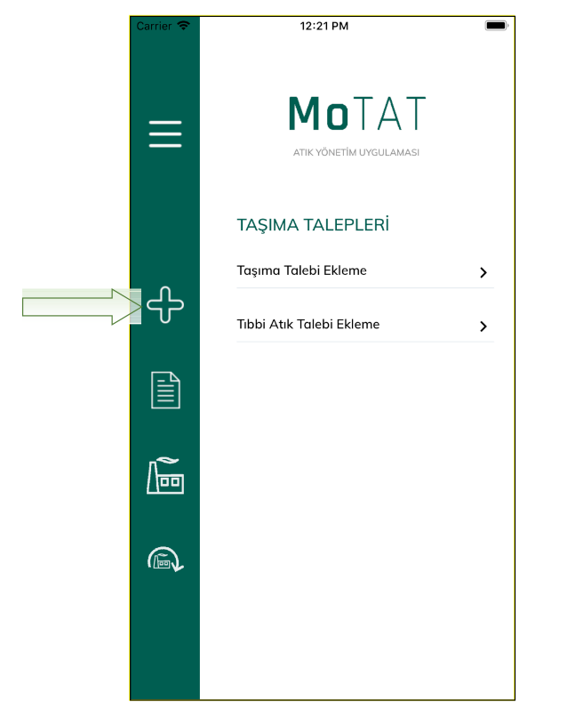 Atık taşıma talebi oluşturmak için aşağıda okla gösterilen butona basılmalıdır. Daha sonra gelen menüde TAŞIMA TALEBİ EKLEME ya da TIBBİ ATIK TALEBİ EKLEME seçenekleri görünecektir.