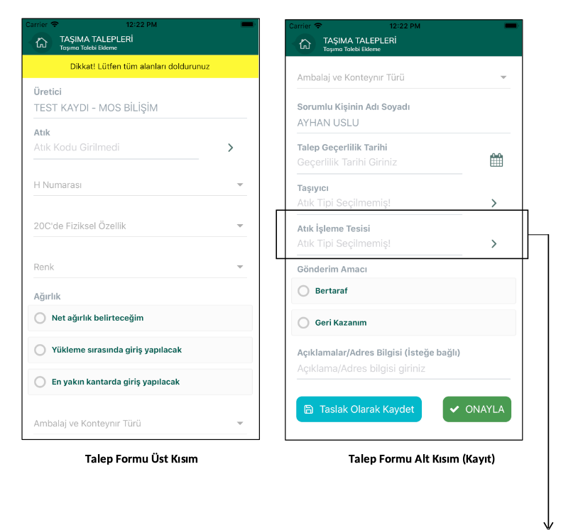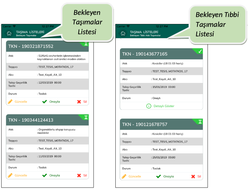 Kullanıcı talep formunda gerekli alanları doldurduktan sonra talebi hemen onaylayabilir ya da taslak olarak kaydedip onayı daha sonrasına bırakabilir. Onaylanmış taşıma talepleri ve taslak olarak kaydedilmiş taşıma talepleri daha sonra BEKLEYEN TAŞIMALAR ya da BEKLEYEN TIBBİ ATIK